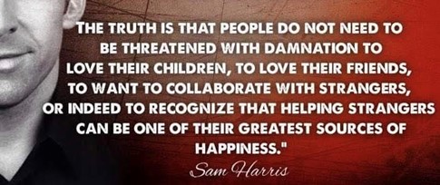Pour assurer leur succès dans l’esprit humain, les stratégies de charité et de compassion semblent avoir composé avec une forme de pensée magique faite de terreur et de contradictions. Mais il y a bon espoir que lorsque nous aurons enfin renoncé à jeter le bébé avec l’eau du bain, nous apprenions à grandir dans les pas d’un Socrate, d’un Confucius, d’un Jésus, d’un Ghandi, d’un Maximilien Kolbe, d’une Edith Stein ou d’un Jean Vanier sans nous accrocher coûte que coûte aux croyances improbables qui furent respectivement les leurs.
