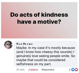 Lorsque je vais donner mon sang, je dois prévoir un temps considérable pour me rendre sur place, me perdre dans les couloirs de l’hôpital Saint Joseph, attendre le moment de me faire trouer le bras parmi une file d’autres personnes animées de la même intention, etc. Qu’est-ce donc qui fabrique en moi cette curieuse décision ? La joie de rendre service est une partie de l’explication à laquelle ma conscience a accès (j’aime bien la joie), et rappelez-vous qu’il y a aussi un goûter offert à la sortie (j’aime bien les goûters) ! Mais en profondeur il y a peut-être la sélection d’un encodage inconscient : la même récompense automatique en joie aura sans doute avantagé mes ancêtres parce qu’en se mettant au service de leur prochain, ces derniers gagnaient le secours des autres une fois venu le jour où c’était à leur tour d’être dans le besoin.