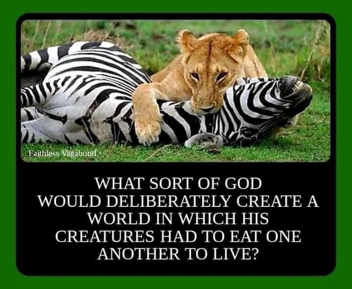 Comment assumer le culte à un dieu dont le projet consiste à regarder le massacre perpétuel d’individus en train de se dépecer vif, se noyer, s’électrocuter, s’empoisonner, s’asphyxier, se bombarder, ou s’affamer les uns les autres pour survivre momentanément dans un monde à la surface limitée et partiellement inhabitable, le tout dans un univers glacial extrêmement hostile à la vie ? Lorsque la théologie ne nie pas cette extraordinaire passivité, elle la présente comme celle d’un père irréprochable ne pouvant guère mieux traiter ses enfants sans violer leur liberté. Bien sûr, ces conceptions de la paternité et de la liberté sont tout ce qu’il y a de plus tordu, mais ce problème-là est moins scientifique que philosophique et moral. Le fait est que, par définition, il n’y a dans l’inaction aucun acte de création.