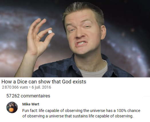 …….En plus de ces confusions, les tenants du « réglage fin » oublient qu’ils interprètent des événements dont ils sont à la fois l’observateur et le résultat. Réglage ou non, il était garanti que nous n’aurions qu’une seule sorte de résultat à interpréter quoi qu’il arrive : un résultat compatible avec le fait que nous soyons là pour vouloir l’interpréter. 👀