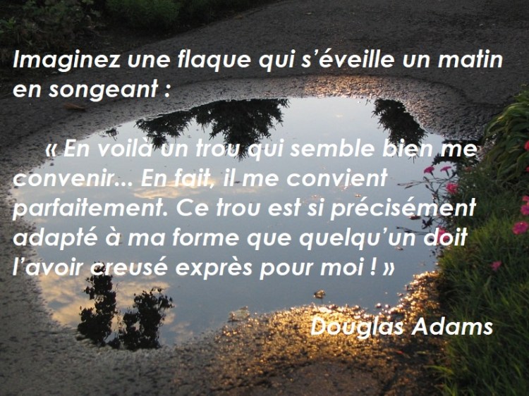 ………  Les chances initiales que vous existiez étaient peut-être quasi-nulles, mais c’est déjà beaucoup comparé à la probabilité que vous ayez la surprise de découvrir un univers incompatible avec votre existence, cette probabilité-là étant strictement et éternellement égale à zéro.