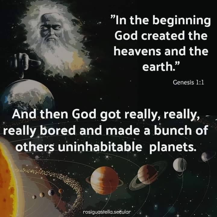 En fait, si l’univers a été créé par un dieu désireux que vous soyez au courant, a-t-il vraiment besoin pour cela que vous achetiez des livres traitant de cosmologie et de physique quantique 🔬🧪 ? A nouveau, l’hypothèse semble un peu curieuse. Personne n’a jamais eu besoin de démonstrations érudites pour vous informer de son existence.