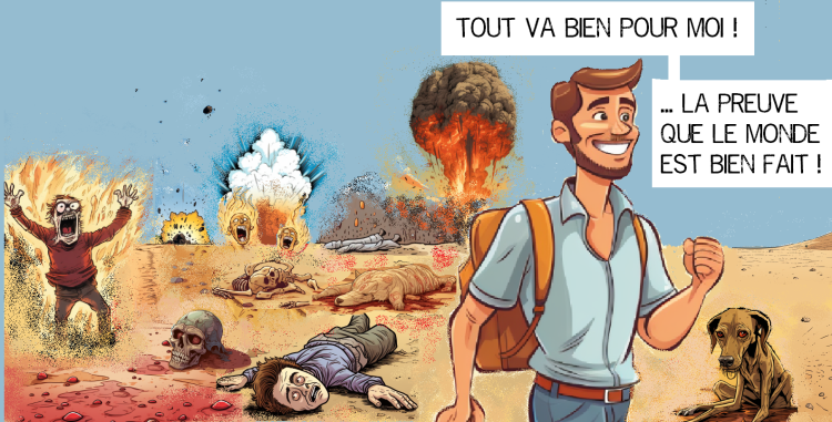 Comme les Bogdanoff, Pangloss raisonne à l’envers. Ce sont évidemment les lunettes qui sont à la mesure des visages humains, et non l’inverse. Rien n’indique que la densité de l’univers a été réglée selon vos besoins, mais tout se passe au contraire comme si nous étions des survivants marginalement et momentanément adaptés à un monde en train de nous imposer son fonctionnement très inhospitalier.